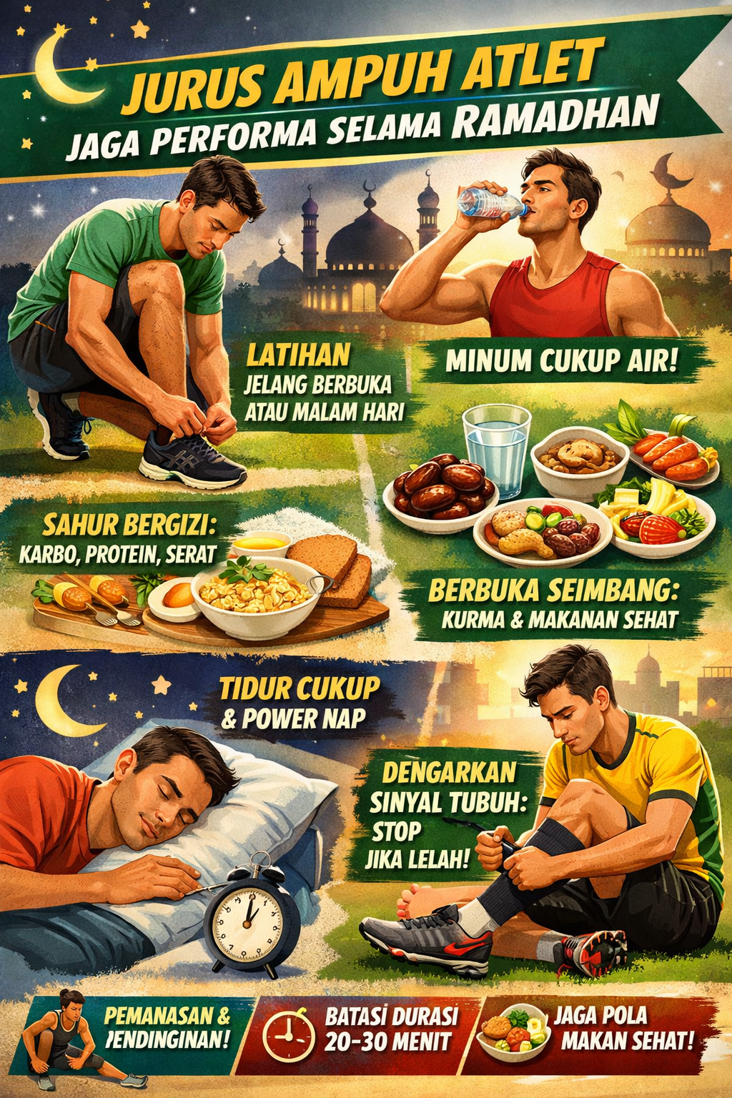 nusatimes.id – Ramadhan bukan alasan untuk “parkir” dari latihan. Justru di momen ini, atlet dituntut bermain cerdas: mengatur ritme, menjaga energi, dan tetap disiplin. Kuncinya ada di manajemen latihan, nutrisi, serta pemulihan yang tepat — kombinasi yang bikin performa tetap on track meski tanpa asupan sepanjang hari.