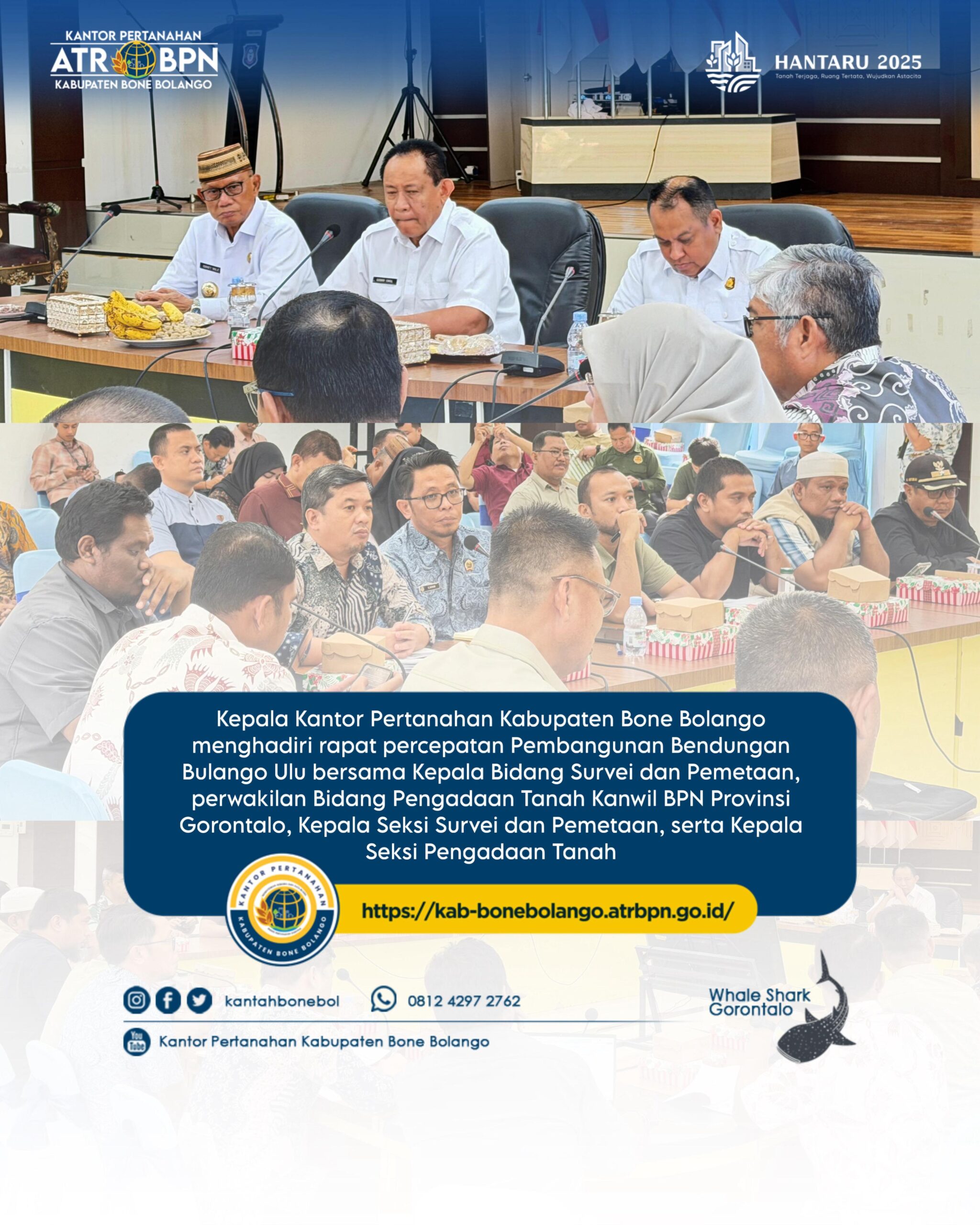 Kantor Pertanahan Kabupaten Bone Bolango menyatakan komitmennya untuk terus mendukung proses pengadaan tanah dan pemenuhan aspek teknis pertanahan lainnya, sebagai bagian dari upaya percepatan pembangunan infrastruktur di wilayah Provinsi Gorontalo.(MY)