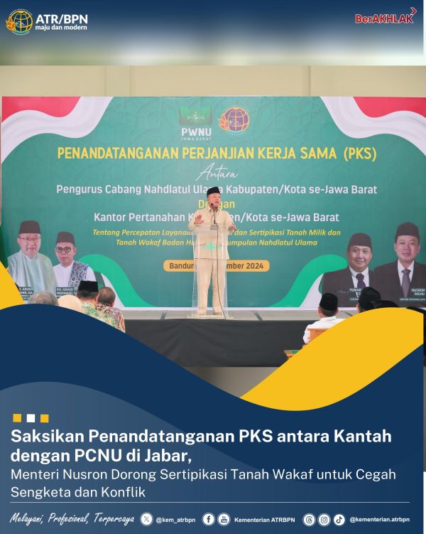 Untuk diketahui, kerja sama yang dilakukan kali ini antara lain terkait percepatan layanan pertanahan dan sertipikasi tanah wakaf milik perkumpulan NU. Penandatanganan PKS ini diwakili oleh empat Kepala Kantah, yakni Kepala Kantah Kabupaten Bogor I dan II, Kabupaten Cirebon, dan Kabupaten Bandung dengan masing-masing Kepala PCNU.