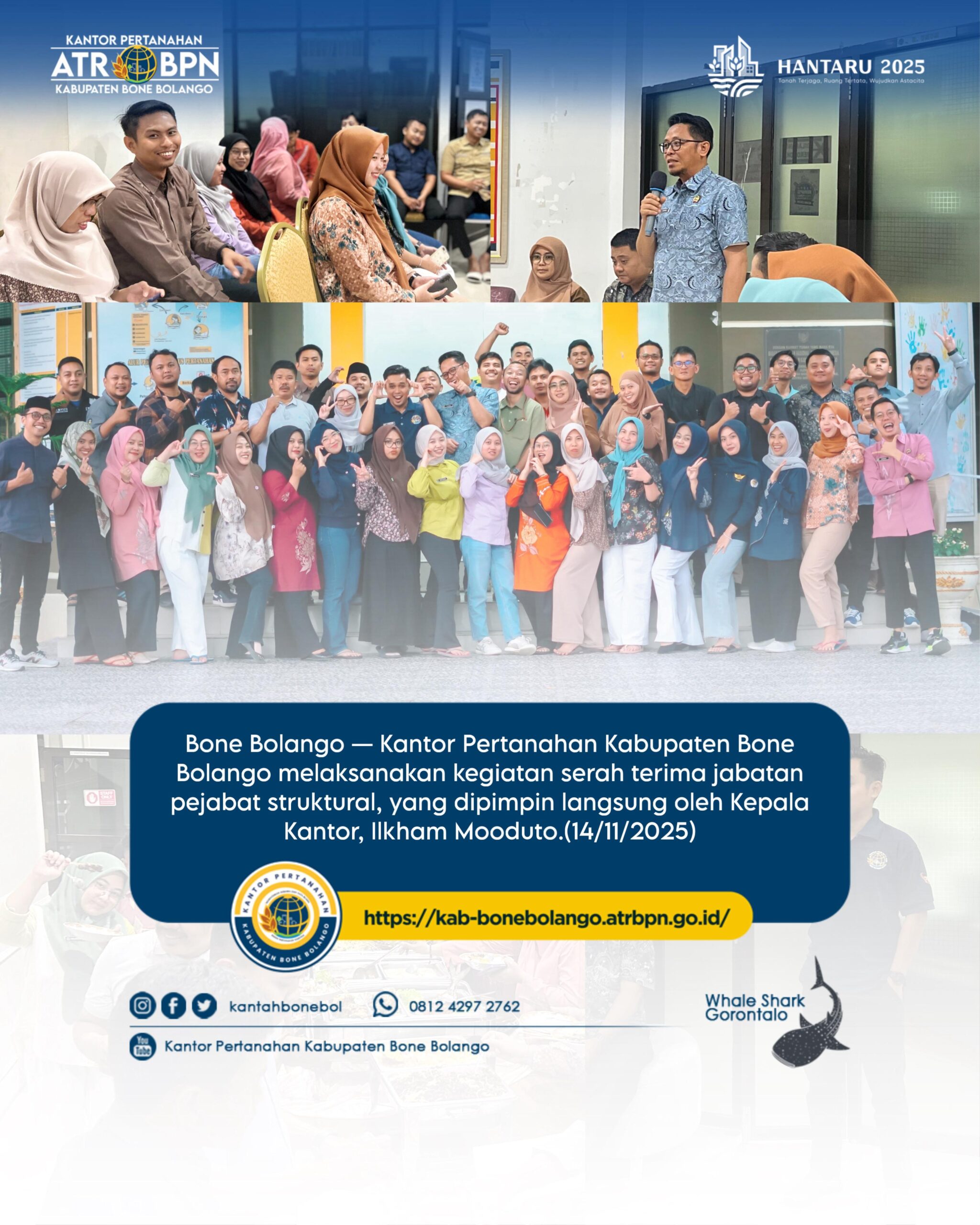 Nusatimes.id — Kantor Pertanahan Kabupaten Bone Bolango melaksanakan kegiatan serah terima jabatan pejabat struktural, yang dipimpin langsung oleh Kepala Kantor, Ilkham Mooduto pada Jum’at (14/11/2025).