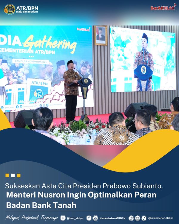 Nusatimes.id (Jakarta) – Menteri Agraria dan Tata Ruang/Kepala Badan Pertanahan Nasional (ATR/BPN), Nusron Wahid ingin mengoptimalkan peran Badan Bank Tanah dalam menyukseskan Asta Cita Presiden Prabowo Subianto. Hal ini diungkapkan saat ia melakukan pertemuan dengan awak media di Aula Prona Kementerian ATR/BPN, Jakarta, Kamis (28/11/2024) malam.